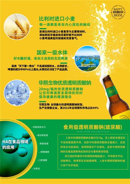 “玻嗨皮的目標是讓精釀啤酒進入主流消費市場。經過多年來的市場培育,越來越多的消費者開始對精釀啤酒表示認可。但是精釀啤酒要進入主流市場,必須在品牌戰略、渠道策略上進行差異化定位。”玻嗨皮總裁勁松說。當前,第一梯隊的精釀啤酒品牌尚未大規模進入主流餐廳渠道,這為玻嗨皮留下了較大的市場空間。 近年來,市場上出現了一大批精釀啤酒的愛好者,隨著各種各樣口味的精釀啤酒出現,精釀啤酒愛好者又分化出了不同的細分人群。各種口味的精釀啤酒都有自己的擁躉,例如有人喜歡棕色艾爾啤酒,有人愛喝世濤啤酒啤酒,有人則唯獨鐘意波特啤酒。眾口難調,已成為精釀啤酒破局的最大難點。 玻嗨皮的做法是在精釀啤酒愛好者與普通消費者之間找到最大的公約數,它通過大量的市場盲測,最終從數十種精釀啤酒類型中確定了比利時白啤作為首發產品。 “比利時白啤,不僅精釀啤酒愛好者喜歡喝,而且普通消費者也愛喝。調研結果顯示,它是這兩類人群接受度最高的精釀啤酒類型。”勁松說,“既要獲得精釀愛好者的支持,又要得到主流大眾的認可,比利時白啤是最佳選擇。” 玻嗨皮的選品過程采用了互聯網企業常用的A/B測試法。騰訊推出微信、字節跳動推出抖音,都是采用的該方法。A/B測試法,即是將兩款不同的產品同時在市場上進行小范圍測試,表現好的產品將推向市場,表現差的產品直接被淘汰。 “我們在全國選擇了幾個有代表性的市場,小規模投放了幾款比利時白啤,最終發現其中一款比利時白啤的市場表現最好,最終上市的產品就是這款產品。”勁松說。 為什么要添加玻尿酸? 確定好首發產品的品種之后,勁松最重要的任務是賦予啤酒健康的屬性。當前,市面上幾乎所有的精釀啤酒都在強調口感。固然,口感是精釀啤酒的核心競爭力,但他認為,僅靠口感,無法與其他精釀啤酒形成差異化的競爭力。 “我們必須開創一個新品類,就像王老吉開創了涼茶品類,元氣森林開創了氣泡水品類一樣,它們都是以健康為抓手,從而開辟了一個無人競爭的新賽道,”勁松說,“這兩個品牌給了我很大的啟發,玻嗨皮要在精釀啤酒中脫穎而出,健康是核心。” 玻尿酸這一神奇物質進入他的視野。玻尿酸,又叫透明質酸,是人體內存在的一種物質,它的補水抗衰功效廣為人知。在2021年之前,它廣泛應用于美容行業。2021年年初,玻尿酸被國家衛健委批準入食。這引起了勁松的好奇與關注。 在進入啤酒行業之前,他在大健康領域工作十多年,對各種保健食品的成分了如指掌。經過研究后,他發現玻尿酸不僅可以抗衰老、美容,而且對保護胃粘膜,對眼睛干澀、關節炎、動脈硬化、腦萎縮等病癥有較好的改善作用。