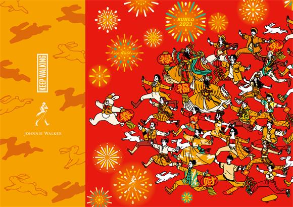 于瑒youngyu的創作理念深受人文社會泛世思想影響,樂于在作品中呈現世人百態和當代浮世繪,于平淡市井中加入天?想象,以輕松潮流的筆觸描摹出一派浮世萬象。 本次與于瑒youngyu的合作是尊尼獲加黑牌與當代插畫藝術的首次融合。在創作過程中,于瑒youngyu將其標志性RUNto形象化身23個年輕身影,身著紳士馬甲的兔子人,帶領眾人向前奔跑;代表蘇格蘭文化的經典角色緊隨而至;闊步向前的酒仙、富含傳統美好寓意的福祿二星、腳踏滑板的新銳板仔、穿上滑雪裝備的冰雪玩家、灑脫無拘的戶外潮咖、身穿漢服的國潮青年、自由不羈的嘻哈男孩、身背吉他的藝術潮人…… 用明亮的顏色、張開雙臂的擁抱、奔跑的姿勢以及和諧統一的律動將品牌KEEP WALKING永遠向前的理念展現出來。同時也傳遞出了可持續的訊號,環保也可以活力無限,一起邁向美好未來,奔“兔”2023。
