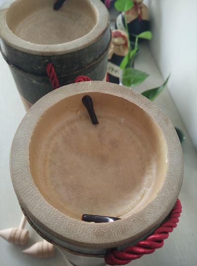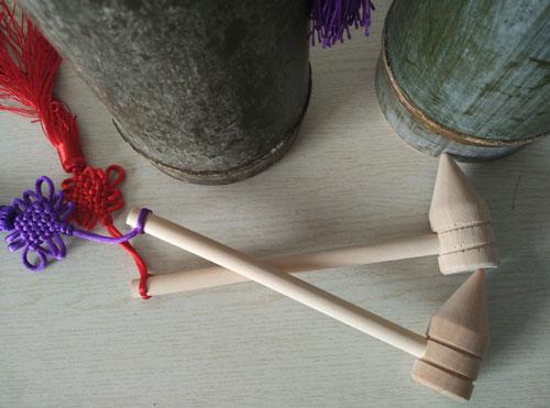 隨竹筒酒配送的木錘很精致,同樣在手柄處系有彩色的中國結吊墜,酒評君稱之為“開瓶器”。只需用開瓶器尖端部位,輕輕敲擊竹筒頂部即可“洞穿”。如下圖:
