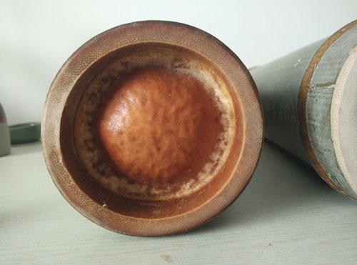 事實上,酒評君并沒有從頂部(系有拎繩的一端)開酒,而是選擇了底部,原因有三:1,從工程力學角度考慮,凸出的底部比凹進的頂部更容易敲開;2,從凸出的底部倒酒,便于把酒全部到出而無殘留;3,由于竹筒的特殊性,酒體中難免會有某些沉淀產生,這樣開酒可以使沉淀物存于凹槽內,這點非常類似葡萄酒的酒瓶凹槽。 凹進的頂部: