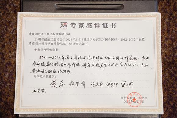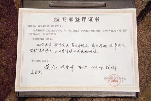 著名白酒專家黃平、賴登燡、楊大金、方長仲、吳天祥、孟望霓等組成的專家組一致認為,國臺國標(2018年釀造)“微黃透明、醬香突出、復合香舒適、醇柔協調、爽凈悠長,空杯留香持久,大曲醬香型白酒風格典型。”