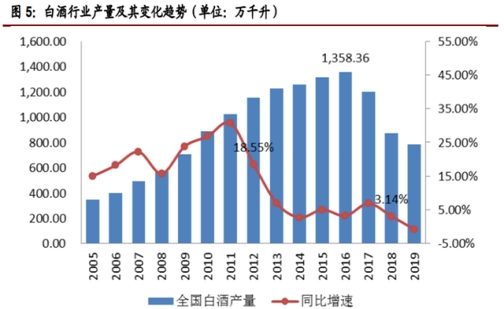 數千年來,白酒作為中國傳統社交文化的一部分,在國人的精神世界中扮演了重要的角色。有關于白酒的佳話、傳說,從夏禹時期的酒祖儀狄,到漢代的司馬相如和卓文君,再到詩仙酒圣李白,可以說是數不勝數。 而進入新千年后,中國的白酒行業,也歷經了一段堪稱曲折的發展時期。 一、 頂峰遭遇寒潮 歷經轉型陣痛 從2005年開始,隨著我國經濟的高速發展以及居民收入水平的快速提升,白酒行業的需求呈現出急劇上升的趨勢。據統計,到2012年時,白酒行業的復合增長超過17%,總產量也逐年攀升,突破了1200萬千升的大關。這一時期,白酒市場呈現出需求和供給兩旺的氣象。 而2012年之后,隨著限制三公消費的政策及舉措落地,政商宴請需求的減少,白酒行業的產能過剩、庫存積壓等風險開始暴露,整個行業也進入了調整期,到2016年,雖然我國白酒總產量達到了歷史新高的1358萬千升,但整個行業野蠻生長的時期已經結束。