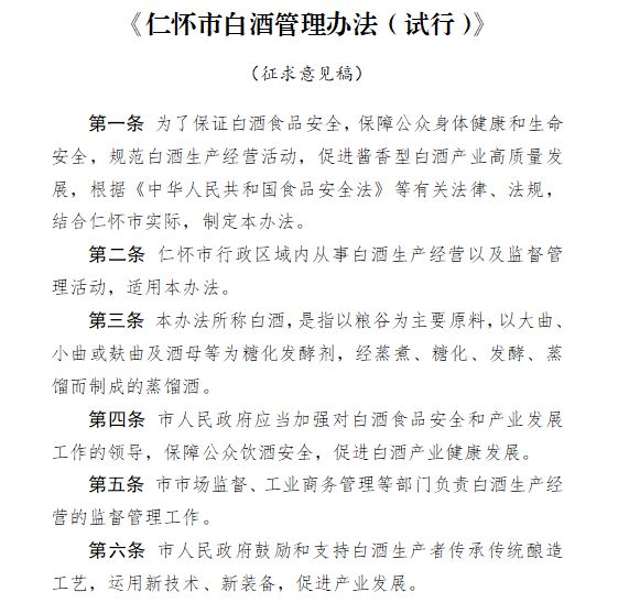 近日,仁懷市市場監督管理局發布的《仁懷市白酒管理辦法(試行)(征求意見稿)》(以下簡稱《管理辦法》),已于2023年9月1日起正式施行。作為仁懷市近年來首部針對白酒產業擬定的管理法規,自然受到了行業和企業的廣泛關注。