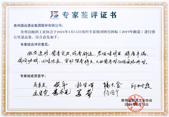 中國著名白酒專家高景炎、賴登燡、楊大金、黃平等組成眾多重量級白酒專家組對國臺國標(2019年釀造)以及國臺國標(2012—2018年釀造)進行品評鑒定。專家組評價認為:國臺國標(2019年釀造),微黃透明,醬香突出,陳香舒適,老酒味明顯,醇厚豐滿,圓潤協調,回味悠長,空杯留香持久,大曲醬香型白酒風格典型。