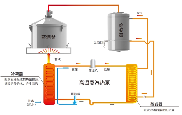 碧淶特高溫?zé)岜眯驼艟埔惑w機(jī)外形圖 碧淶特高溫?zé)岜眯驼艟埔惑w機(jī)原理圖 自2023年起,貴州仁懷市茅臺(tái)鎮(zhèn)已有數(shù)家醬香型白酒生產(chǎn)企業(yè)使用廣東碧淶節(jié)能設(shè)備有限公司研發(fā)生產(chǎn)的特高溫?zé)岜眯驼艟埔惑w機(jī)做白酒的蒸糧、蒸酒及打糧水的生產(chǎn),取得非常好的節(jié)能減碳的效果。采用該機(jī)組生產(chǎn)白酒,相比天然氣鍋爐生產(chǎn)節(jié)省成本50%以上,相比電鍋爐(電蒸汽發(fā)生器)節(jié)能60%以上。