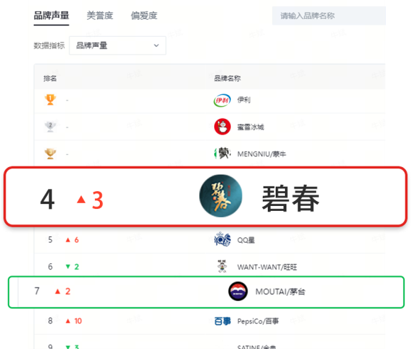 首先,向碧春表示熱烈的祝賀! 2024年8月19日,根據最新發布的抖音權威榜單巨量云圖數據顯示,碧春憑借其卓越的表現,成功超越了茅臺,榮登酒類產品聲量榜榜首,并在食品飲料全行業中位列第四。這一輝煌成就,距離碧 ...