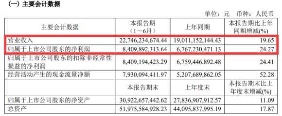 8月27日晚間,汾酒發布了2024年半年度報告。報告顯示,今年1-6月,汾酒實現營業收入227.46億,同比增長19.65%;實現凈利潤84.1億,同比增長24.27%。