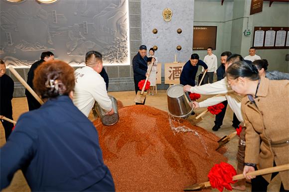 隨著投產儀式正式啟動,出席儀式的領導率先投入到潤糧操作中。伴隨著鏗鏘有力的號子,酒師們手中的鐵锨不停翻轉,紅沙在空氣中翩翩起舞并逐漸翻拌均勻,緩緩拉開新一年的釀酒生產。