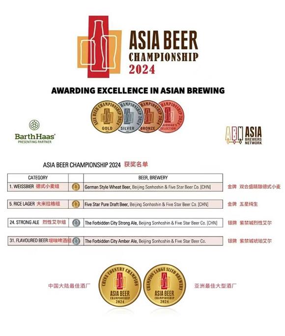 在剛剛結束的2024年亞洲啤酒錦標賽(Asia Beer Championship, 簡稱ABC)上,中國啤酒生產商北京雙合盛五星啤酒有限公司(以下簡稱雙合盛五星公司)一鳴驚人,斬獲兩金兩銀,并且在全場決賽中更是獲得“亞洲最佳小麥啤酒”“亞洲最佳拉格啤酒”兩項大獎,成為本屆大賽最大贏家,并毫無爭議地獲得“中國大陸最佳酒廠”“亞洲最佳大型酒廠”稱號。