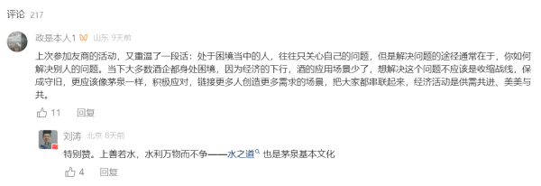 個人IP賦能,視頻轉發量近十萬 “近些年來,很多個人躺平了,但真正的企業家不會躺平”。 在視頻中,劉濤這樣說道。他的這一觀點直擊當下社會的痛點,自然引發了廣泛共鳴。在視頻留言區,就有酒業從業者表示,“當下大多數酒企都深處困境,想解決這個問題不應該是收縮戰線、保成守舊,更應該像茅泉一樣積極應對。”