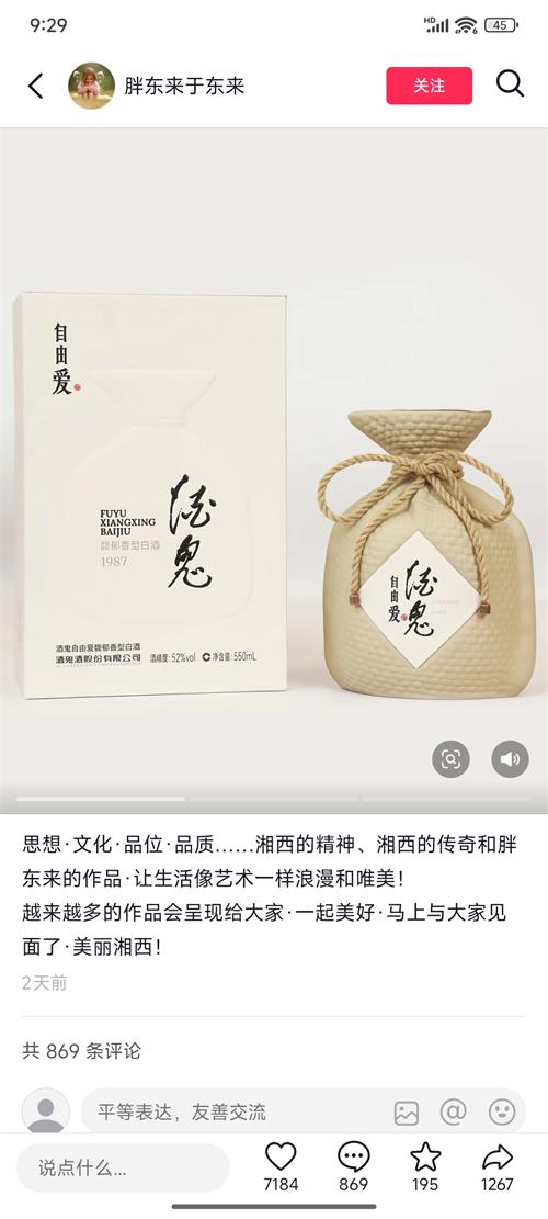 6月29日,胖東來創(chuàng)始人于東來通過抖音首次公布“酒鬼酒·自由愛”聯(lián)名產(chǎn)品,配文中他寫到:“湘西的精神,湘西的傳奇和胖東來的作品,讓生活像藝術(shù)一樣浪漫與唯美,馬上與大家見面了,美麗湘西!”,宣布新品即將上市。