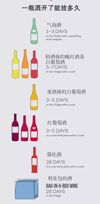 很多人都喜歡偶爾獨(dú)酌一兩杯,但經(jīng)常苦惱一瓶750mL的酒,一次性喝不完怎么辦?出于健康的原因,我們也不建議大家每次開瓶了為了不浪費(fèi)就一定非要喝完不可。那么問題來了——一瓶酒開了后,能放多久? 最好別超過三天……有朋友抱怨說,這太短了,不同類型的葡萄酒是不是開瓶后能夠保存的時(shí)間也不一樣呢?沒錯(cuò),先給大家看張圖吧: