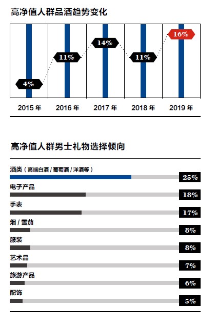 據英國《金融時報》威士忌消費調查,發現有過海外留學或旅游經歷的消費者,對威士忌有著強烈的偏好。這個群體中有59%的人每月會至少會喝三次威士忌,而沒有在海外生活或旅游過的人群中,這個比例只有21%。 這些有過長時間的海外生活經歷和對威士忌文化高度認同的中國消費者,在一定程度上不但推動了威士忌在中國市場銷量的突飛猛進,還帶動了價格的持續上漲。 高凈值人群的壯大成為威士忌市場增長的強勁動力 對于茅臺、五糧液為首的中國名酒而言,高凈值人群始終是其主要爭取目標,而這些高凈值人群同樣是威士忌、紅酒、干邑等高端酒類的主要消費力量。根據《胡潤百富2019中國酒類消費行為白皮書》顯示,高凈值人群對于品嘗美酒的青睞程度在近5年來保持持續增長趨勢,對于品酒的喜愛度逐年上升,同時他們也將高端酒類作為社交場合贈禮的最佳選擇。
