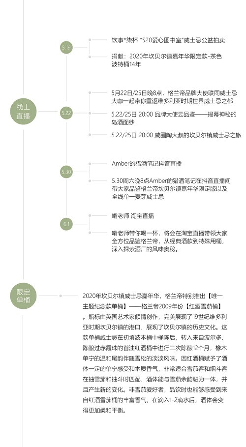 提起今年格蘭帝的嘉年華限定版,其初衷是給全球各地沒能親臨坎貝爾鎮的粉絲提供一個共同慶祝的機會,國內市場也爭取到了一些珍稀份額。往年要漂洋過海親自飛去蘇格蘭才搶得到的酒款,今年足不出戶也能喝到。 不過有趣的是回看格蘭帝每一次的桶型選擇,都令人眼前一亮。作為坎貝爾鎮的遺珠,格蘭帝無論是2018年嘉年華推出的紅寶石波特桶、19年推出的朗姆桶還是今年的茶色波特桶,都是對坎貝爾古老風味的一種復原: 這些選桶均為坎貝爾鎮歷史上曾使用過的桶型,在那個黃金年代,運輸朗姆酒桶與波特桶的商船會在前往格拉斯哥的途中停靠坎貝爾港,當時的酒廠就是用這些橡木桶,陳釀出了名震全球的坎貝爾威士忌。 除此之外,身為國內粉絲,官方還為我們準備了許多獨家活動與福利: